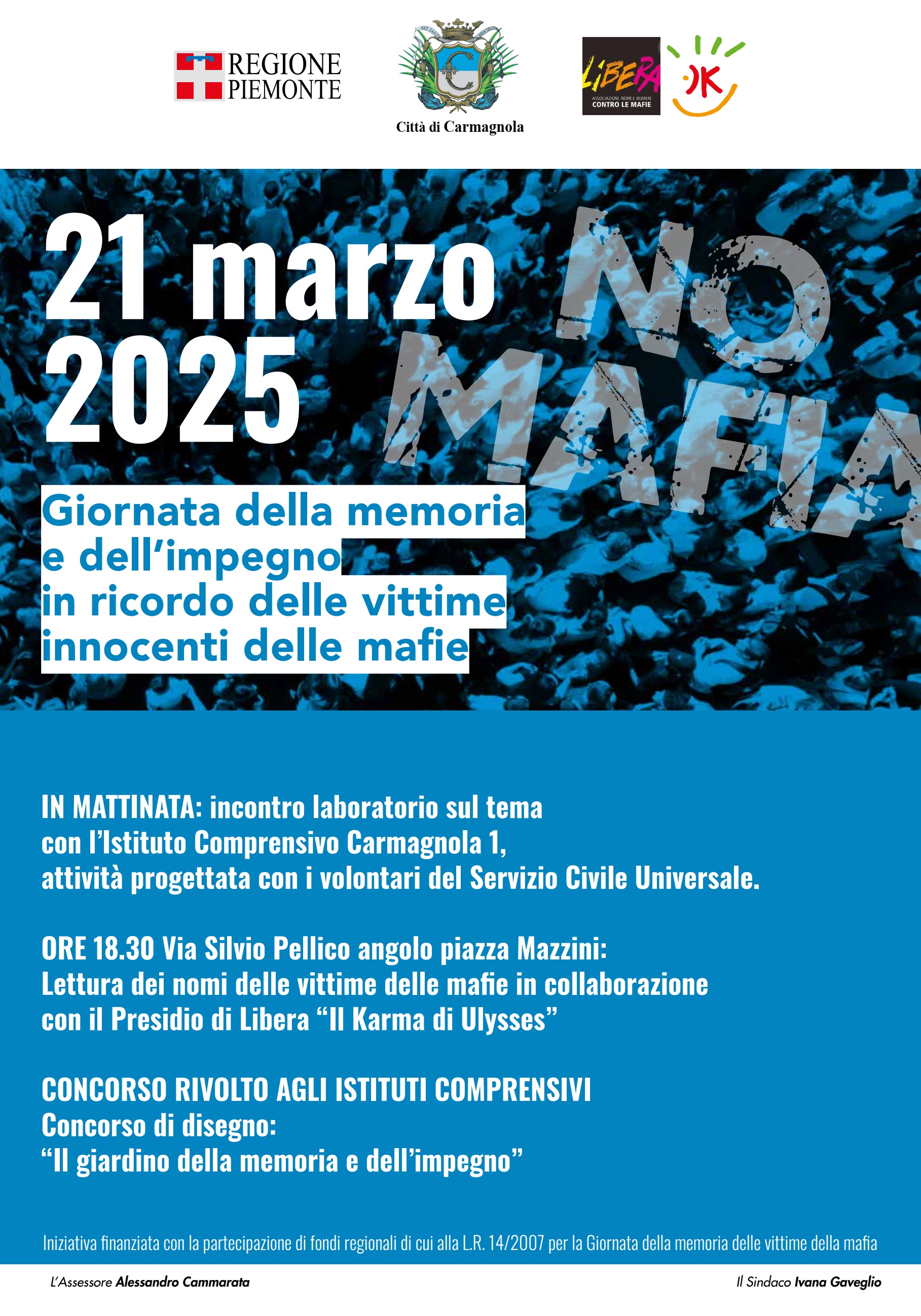 Venerdì 21 marzo 2025 la Città di Carmagnola celebra la "Giornata della memoria e dell'impegno in ricordo delle vittime innocenti delle mafie" con una serie di iniziative, sostenute attraverso fondi che la Regione Piemonte ha messo a disposizione ai sensi della Legge Regionale 14/2007, organizzate in collaborazione con il presidio locale di Libera "Il Karma di Ulysses" e con la partecipazione delle scuole locali.