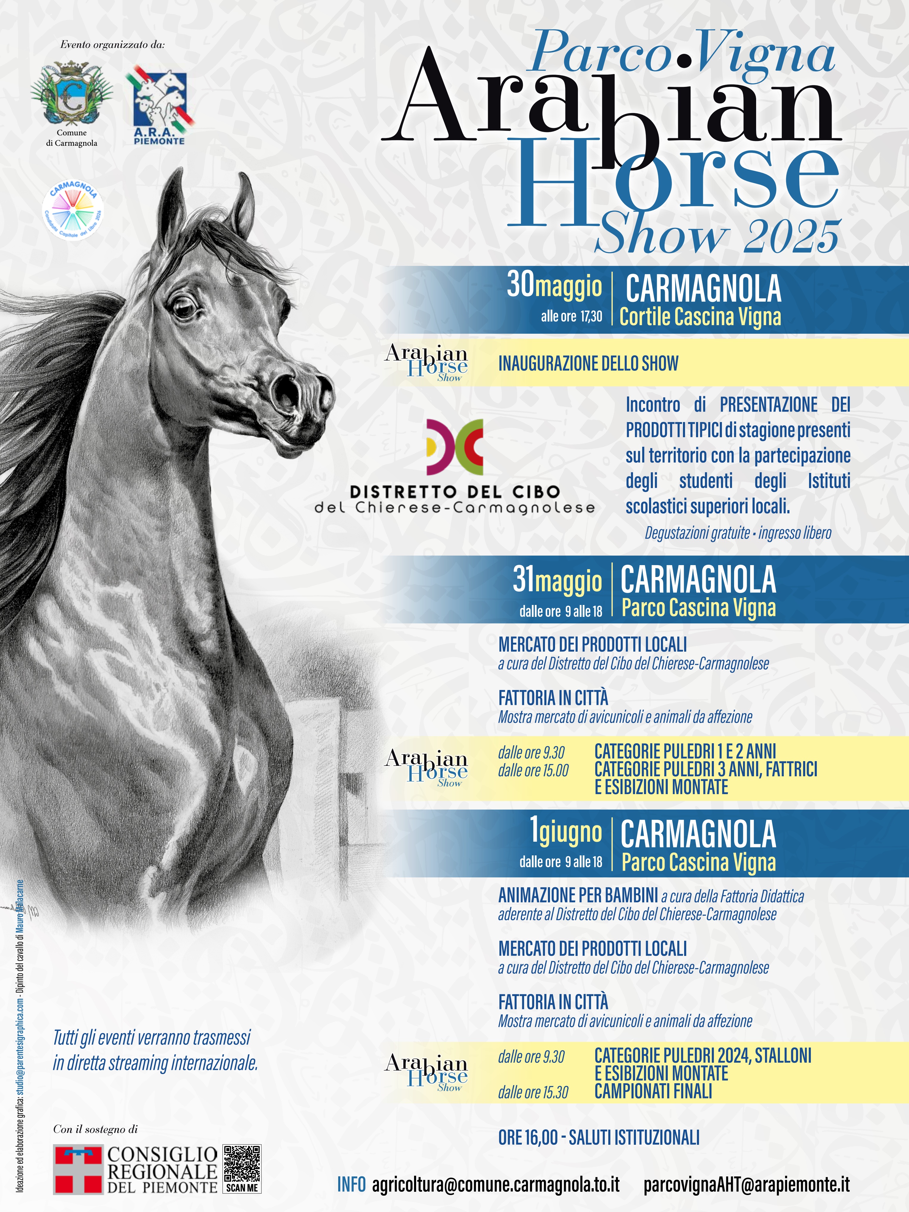 Dopo il grande successo della prima edizione, il Comune di Carmagnola ha confermato che il Parco Cascina Vigna ospiterà nuovamente il Parco Vigna Arabian Horse Show nelle date del 31 maggio e 1° giugno 2025.
