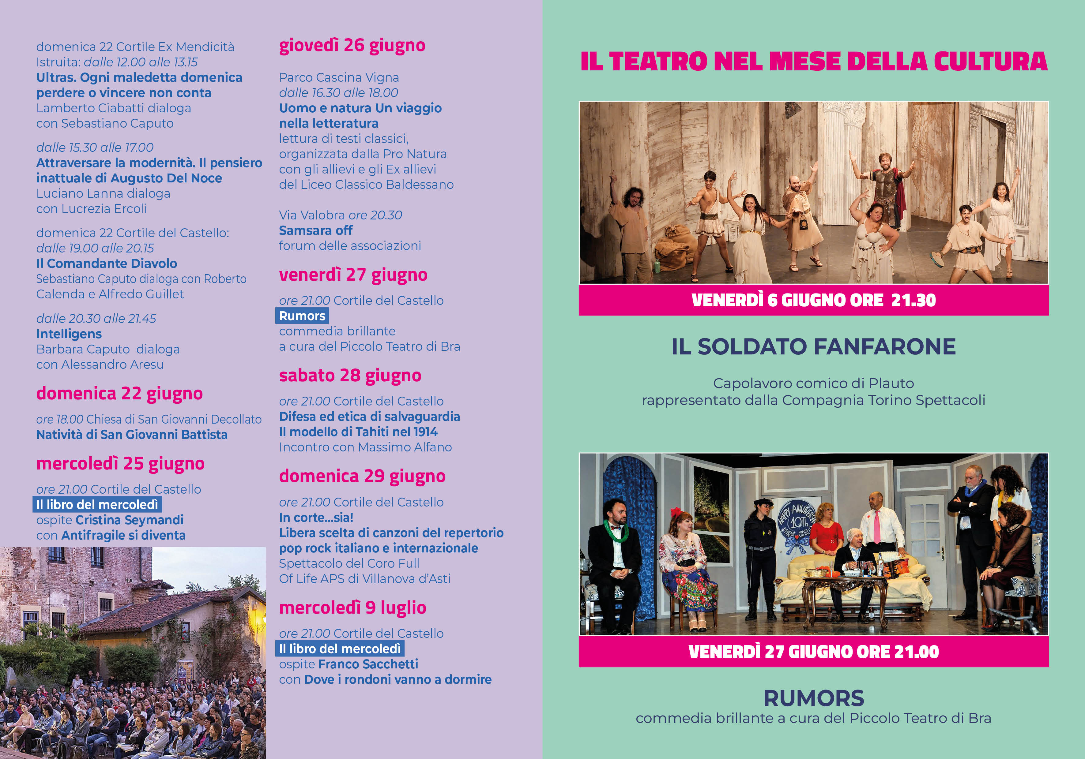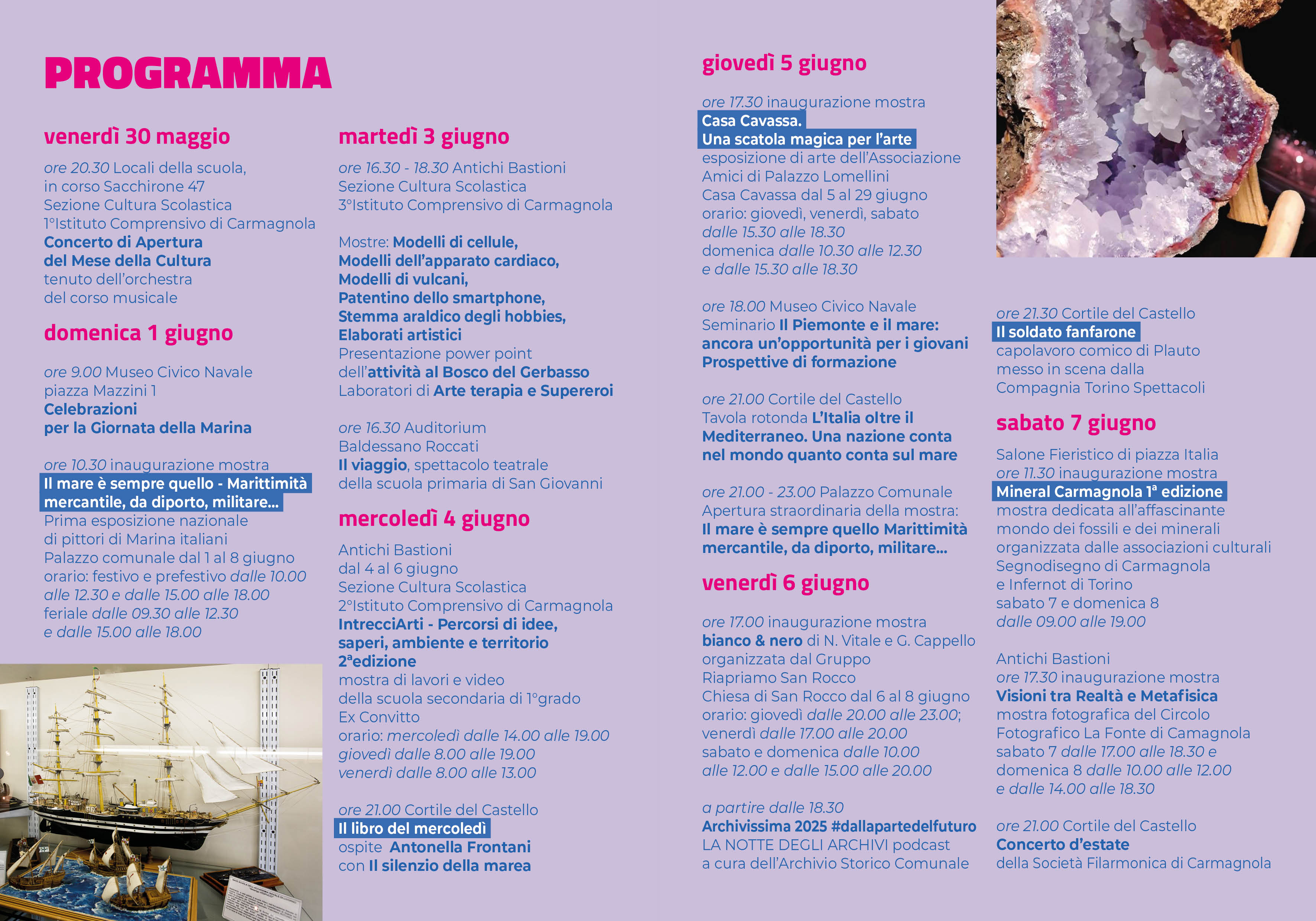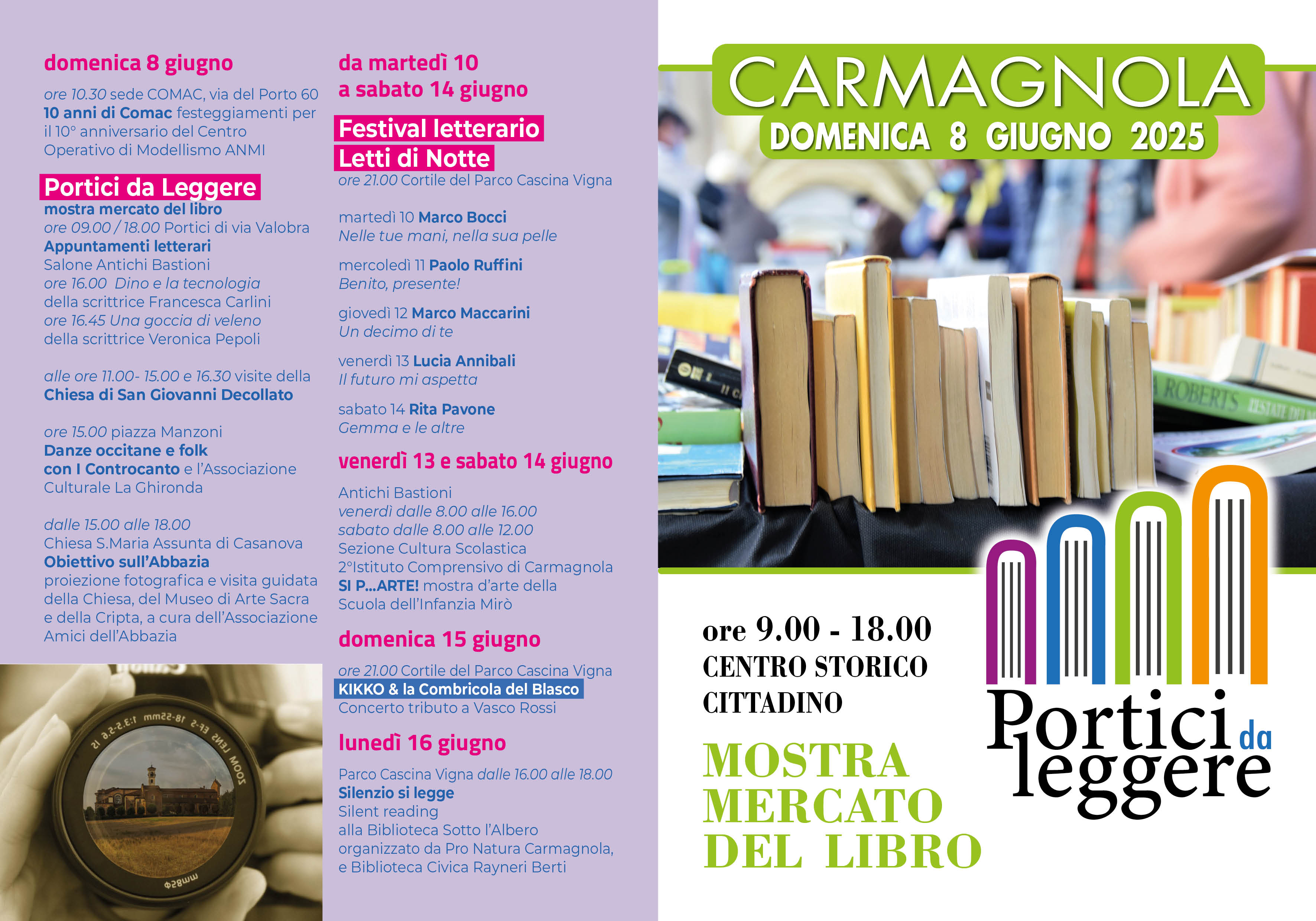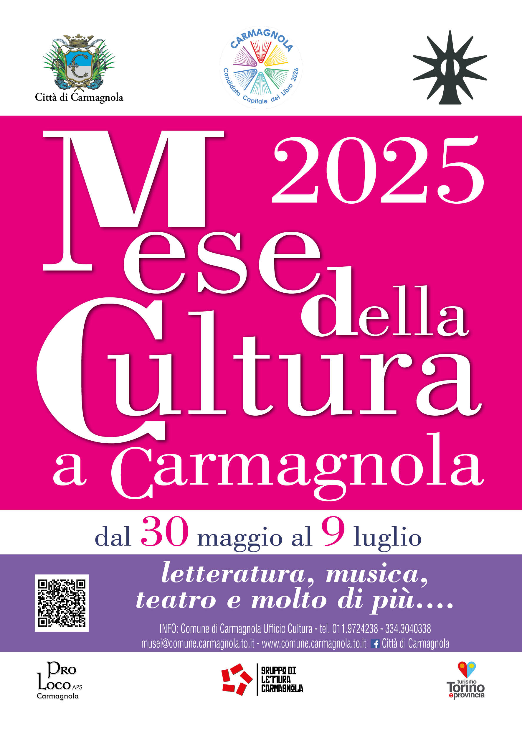 Il Mese della Cultura di Carmagnola si propone anche quest’anno come un’occasione importante per promuovere la partecipazione attiva e la crescita culturale della comunità, coinvolgendo realtà artistiche locali e ospiti di rilievo nazionale. Grazie alla collaborazione con diverse associazioni cittadine, la rassegna propone una vasta gamma di eventi che abbracciano molteplici forme d'arte, dalla letteratura alla musica, dal teatro alle mostre.
