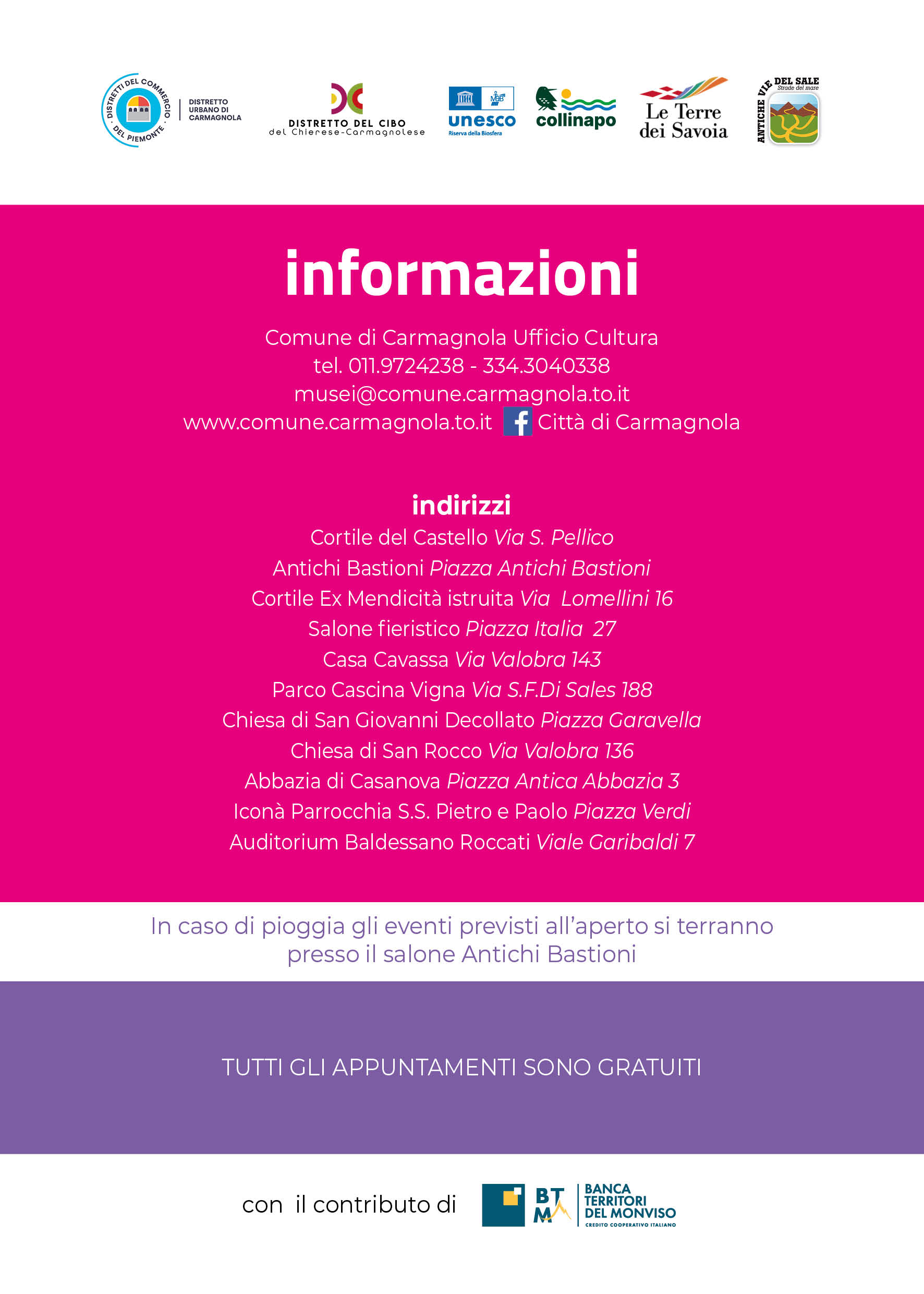 Per ulteriori informazioni, è possibile contattare l'Ufficio Cultura del Comune di Carmagnola ai numeri 011.9724238 – 3343040338 o inviando un’e-mail a musei@comune.carmagnola.to.it