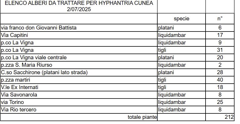Si avvisa la cittadinanza che domani notte 02/07/2025 proseguiranno i trattamenti alla piante per Hypantria Cunea. In allegato l'elenco degli alberi interessati