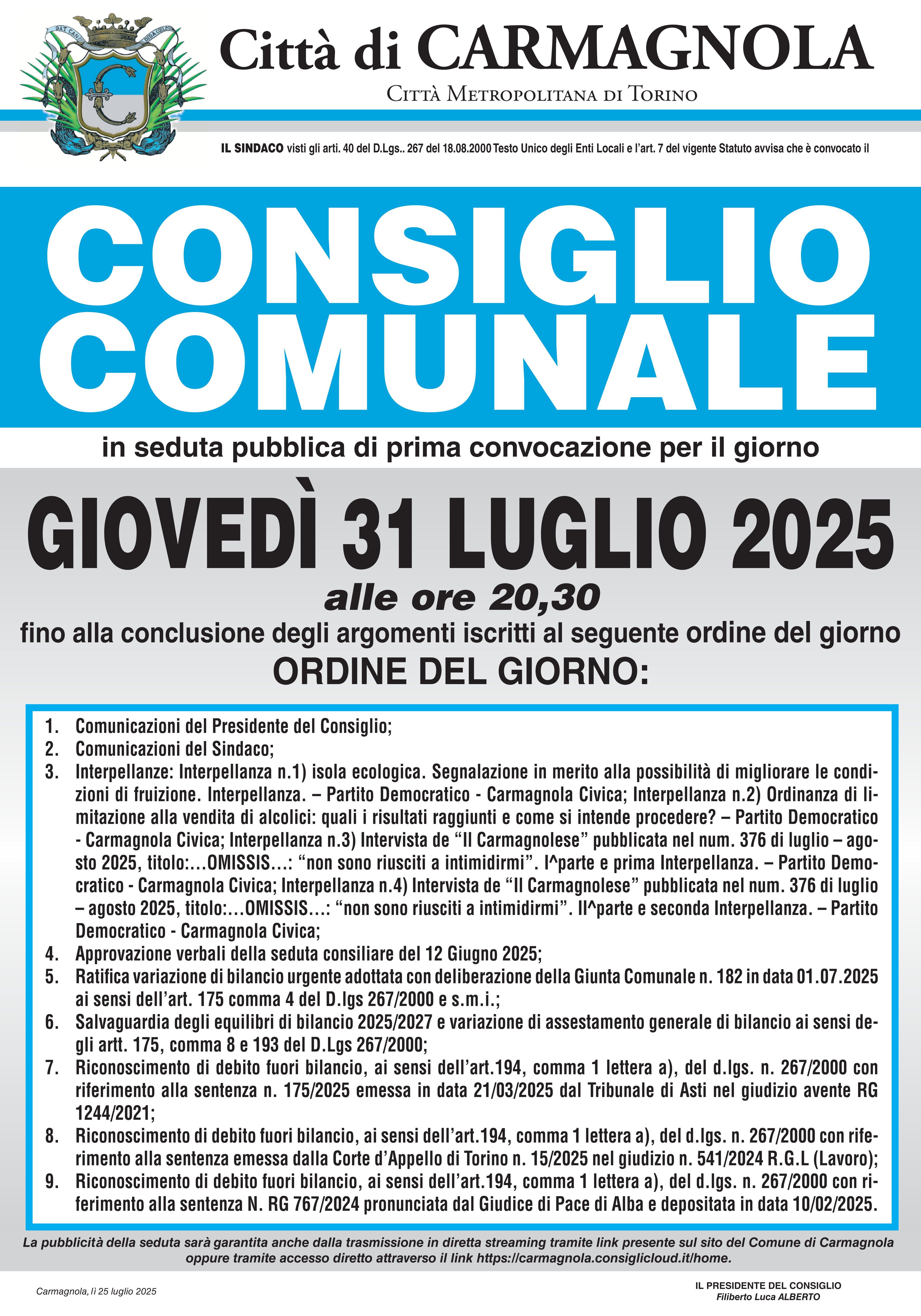 Giovedì 31 Luglio alle ore 20.30 è convocato il Consiglio Comunale in seduta ordinaria pubblica di prima convocazione.