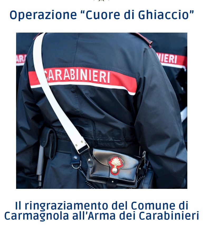 Operazione "cuore di ghiaccio": il ringraziamento del Comune di Carmagnola all'Arma dei Carabinieri
