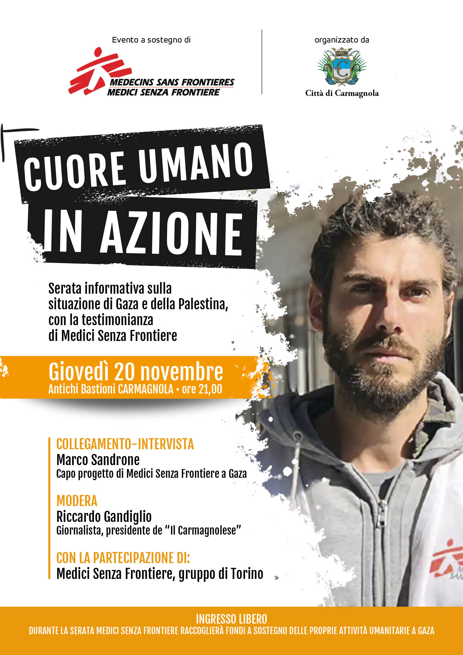 L’Amministrazione comunale di Carmagnola organizza per giovedì 20 novembre una serata pubblica di informazione e sensibilizzazione dedicata alla situazione umanitaria a Gaza. L’iniziativa nasce da un ordine del giorno approvato dal Consiglio comunale, che impegna il Comune a promuovere momenti di approfondimento e confronto su un tema di grande rilievo internazionale e umano.
