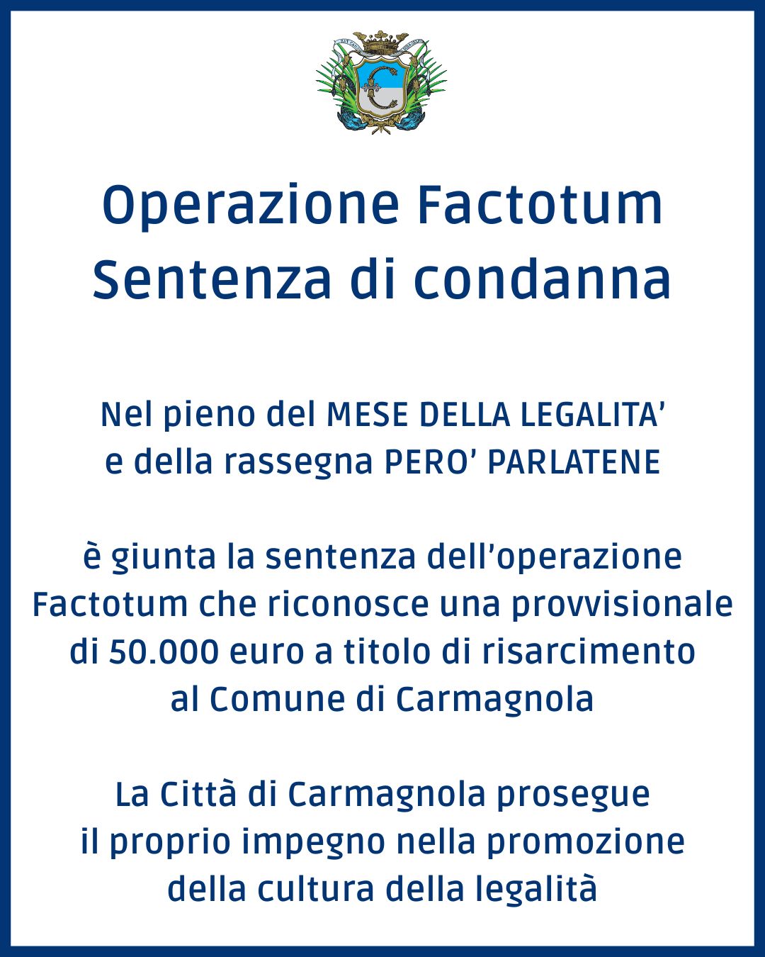 La notizia giunge in concomitanza con lo svolgimento del Mese della Legalità, che a Carmagnola comprende la rassegna “Però Parlatene. Raccontare la legalità per costruire consapevolezza”, promossa dal Comune in collaborazione con Avviso Pubblico. Enti Locali e Regioni contro mafie e corruzione.