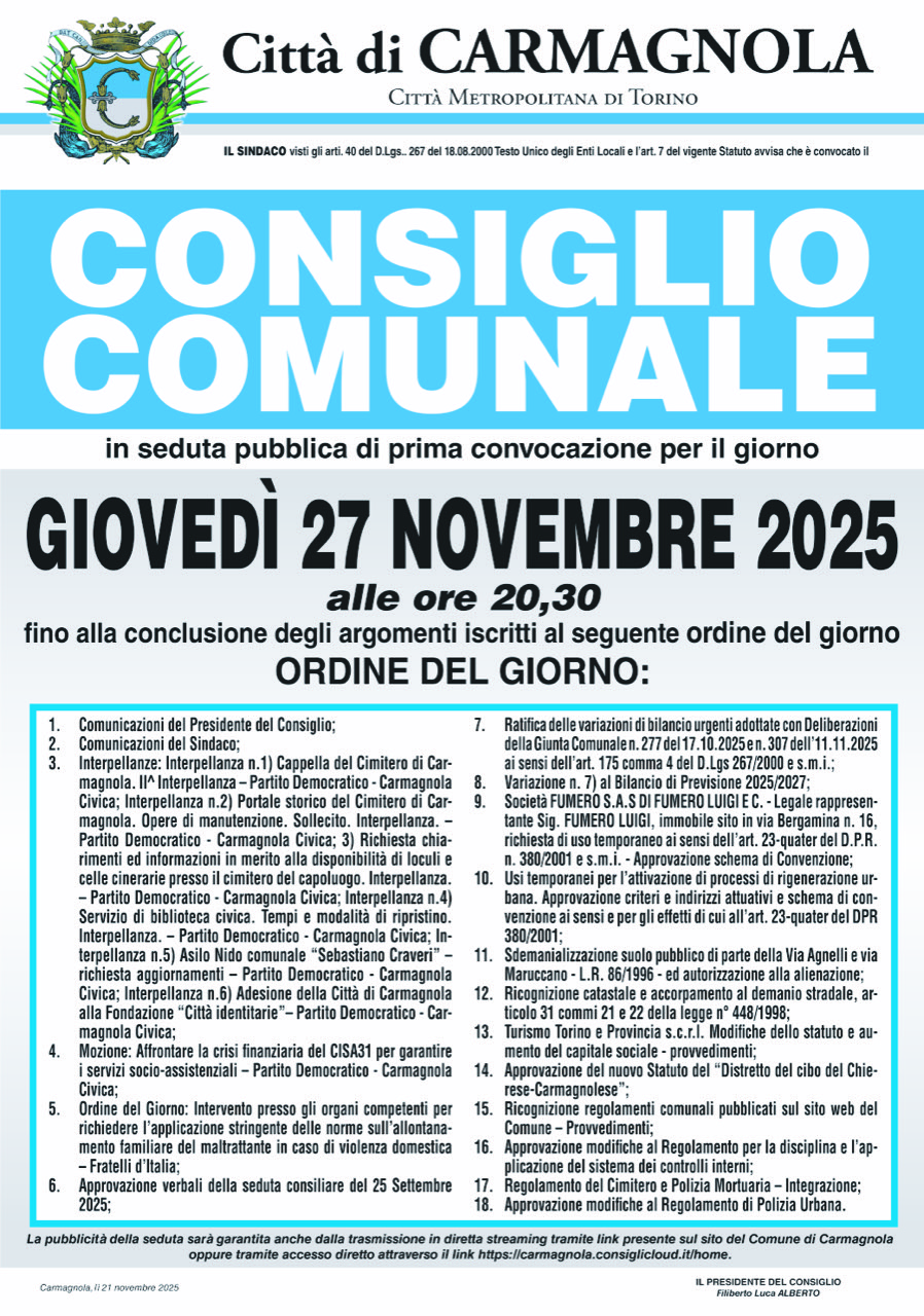 E' convocato per giovedì 27 Novembre alle ore 20.30 in seduta pubblica di prima convocazione il Consiglio Comunale