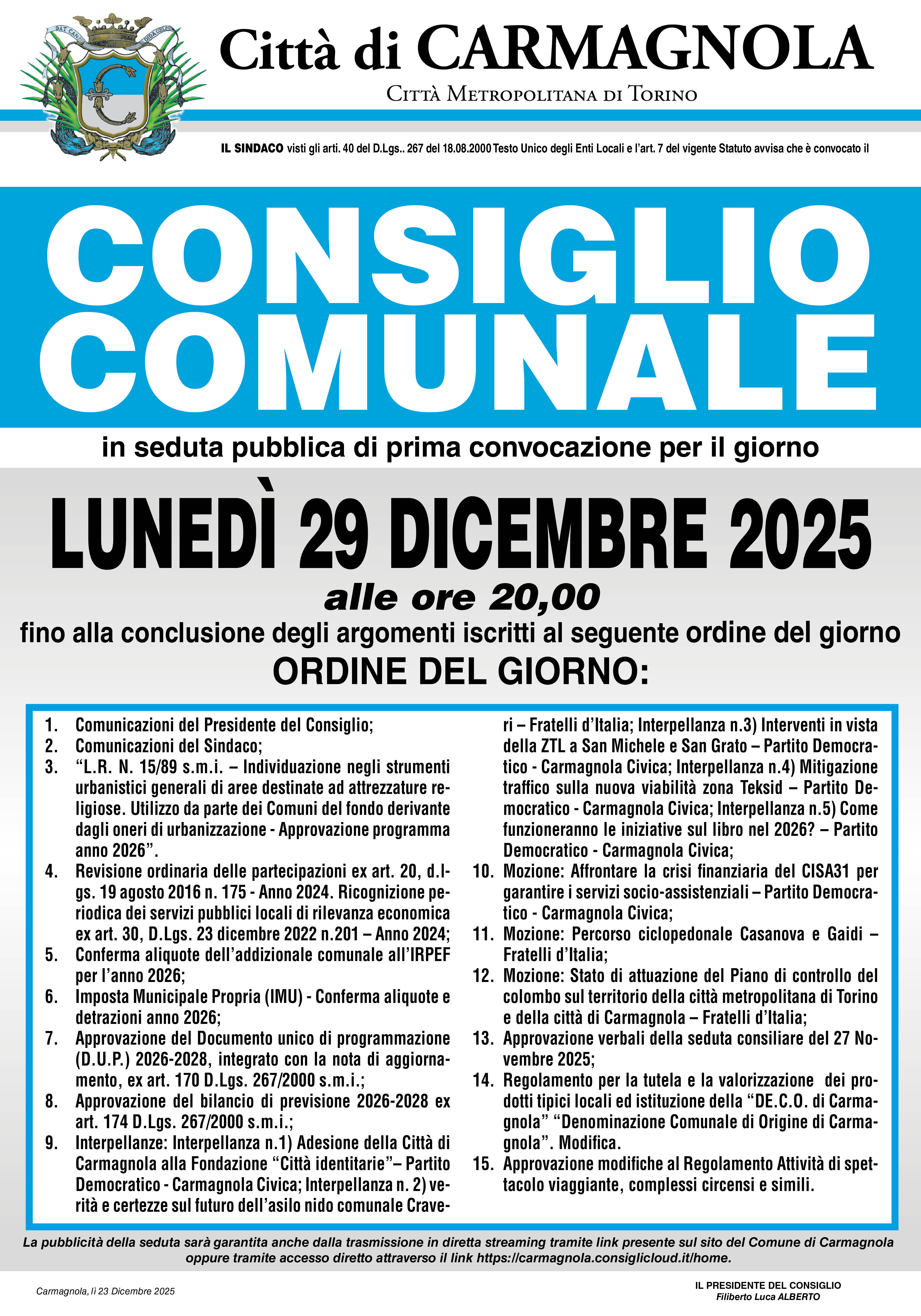E' convocato per lunedì 29 Dicembre alle ore 20.00 il Consiglio Comunale in seduta pubblica di prima convocazione fino alla conclusione degli argomenti iscritti all'Ordine del Giorno