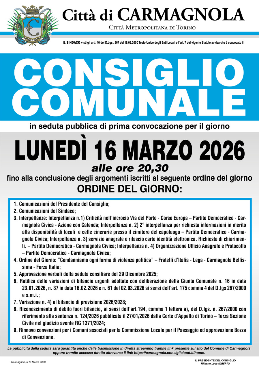 E' convocato in seduta pubblica di prima convocazione il Consiglio Consiglio Comunale per lunedì 16 Marzo 2026 alle ore 20.30