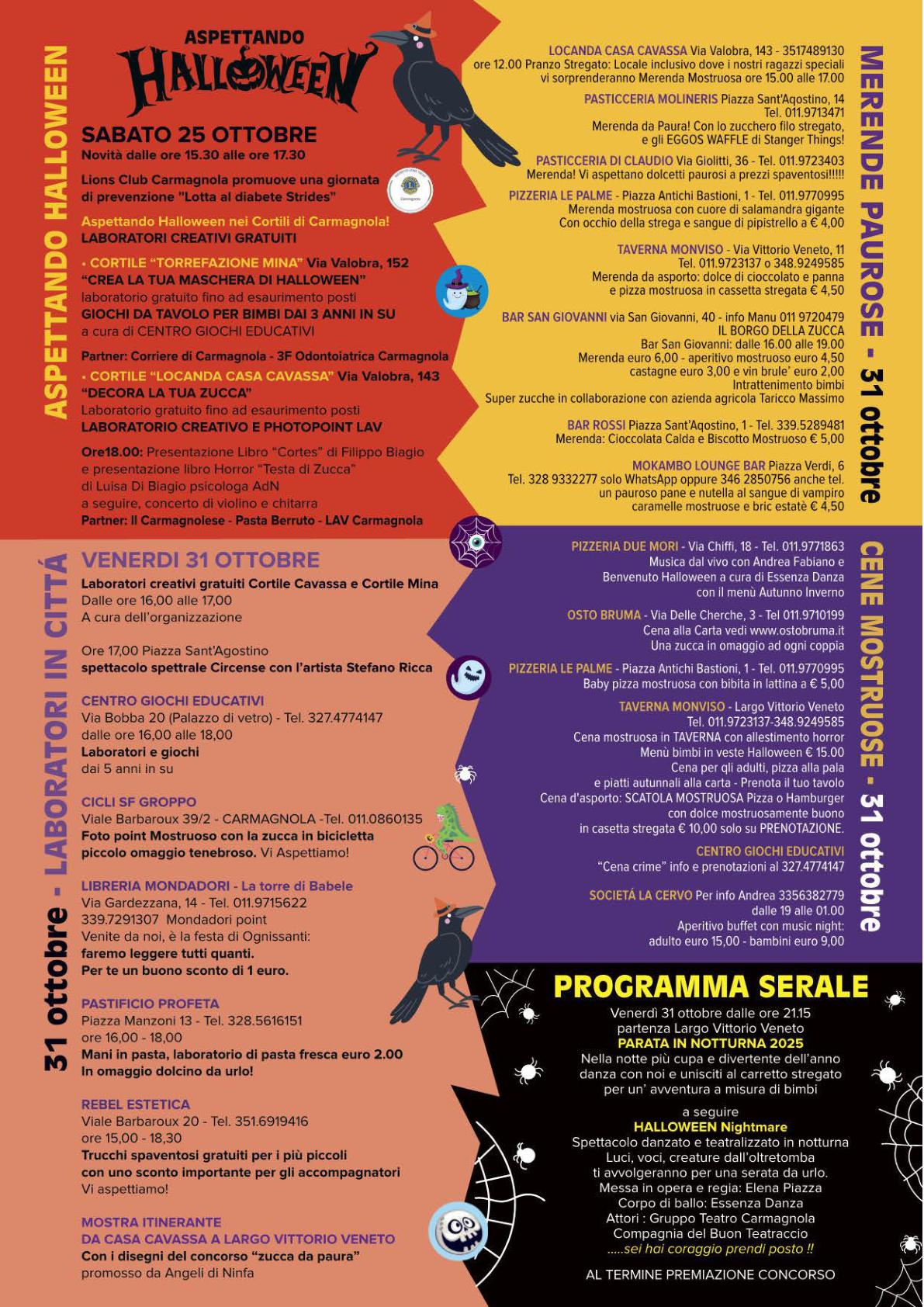 Sabato 25 ottobre, con una speciale anteprima tra laboratori creativi, giochi, presentazioni di libri e uno speciale tour delle tenebre con teatro e degustazioni nel centro cittadino.L’anteprima della manifestazione include anche il “Tour delle Tenebre”, un’esperienza serale inedita per scoprire Carmagnola in chiave teatrale e sensoriale.