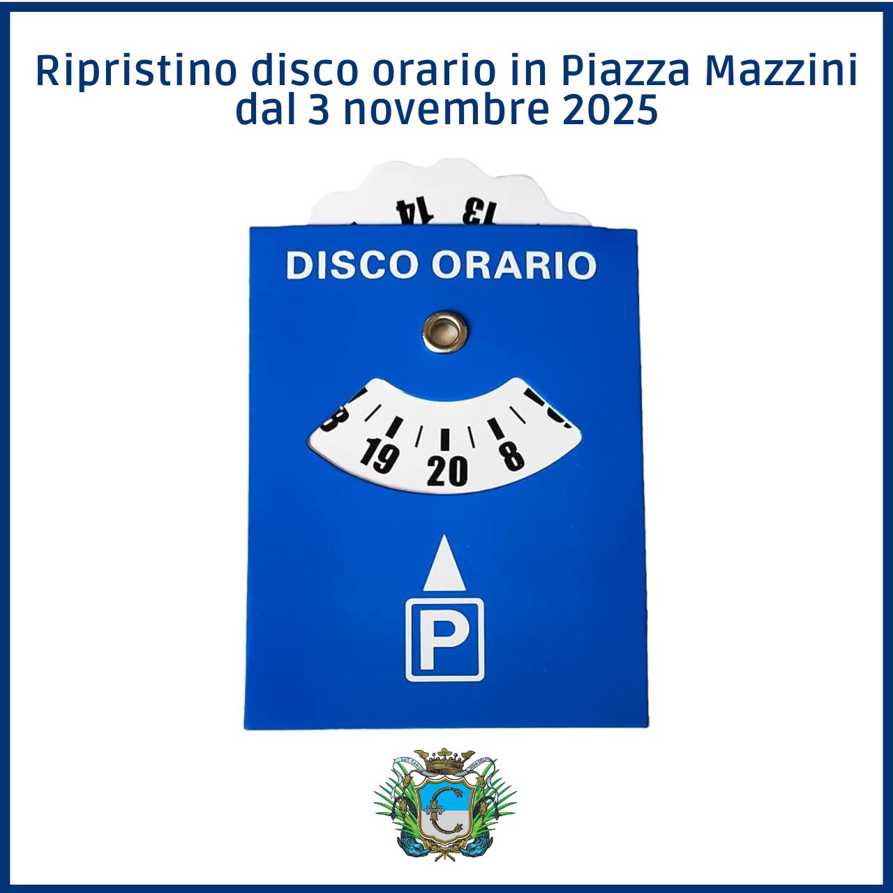 A partire da lunedì 3 novembre 2025 tornerà in vigore la sosta regolamentata a mezzo di disco orario nella parte interna di Piazza Mazzini.